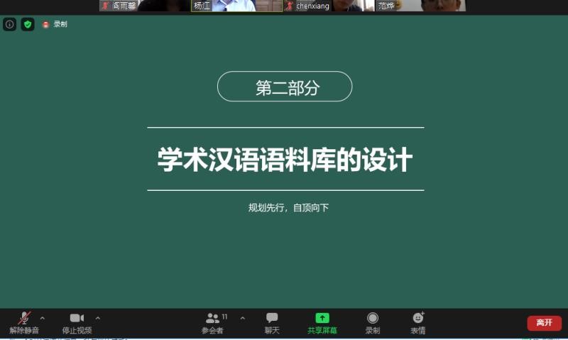 6月17日上午10点,湖南科技大学外国语学院的杨江副教授为我院师生开展了一场主题为“学术汉语语料库的创建与应用”的线上学术讲座。该讲座在ZOOM会议平台上举行,会议由我院陈香副院长主持,我院2019级汉语国际教育硕士生在线聆听了本次讲座。