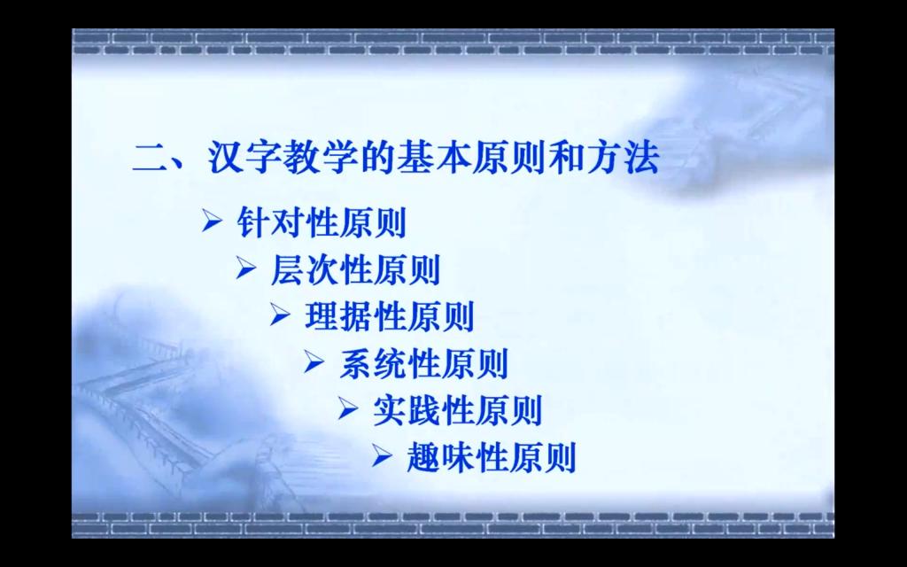 针对性原则即根据学生的国别和母语背景设计教学;层次性原则指区别各个层次汉字教学的需求和内容,循序渐进,分层推进;理据性原则要求从理据上把握汉字,指导学生运用理据分析的方法;系统性原则强调运用系联归纳的方法,把所学的汉字类型化、条理化;实践性原则强调通过大量的认读和书写掌握汉字;趣味性原则指利用好汉字构型的趣味性,提高汉字教学的效益。