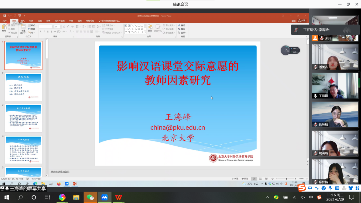 2021年6月29日10时,北京大学对外汉语教育学院博士生导师王海峰教授在我院成功开展了题为“影响汉语课堂交际意愿的教师因素研究”专题讲座。本次讲座采用线上线下相结合的方式举行。讲座由伟德国际1946bv院长李春玲教授主持。我院汉语国际教育硕士专业导师、预科生教师以及全体2020级和2021级汉语国际教育硕士专业研究生参加了本次讲座。