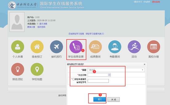 Click学生信息变更toinputyournationality, date of birth, andstudent ID No, then clickSubmit
