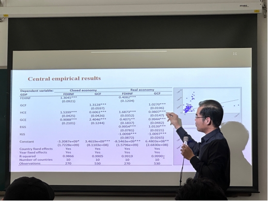 紧接着,来自柬埔寨的世界经济专业博士研究生苏安山(Soksan Liv)围绕《通过银行中介机制的下沉基金与经济增长》这一主题进行了分享。他结合其对全球多个经济体的实证研究,指出下沉基金不仅有助于公共债务管理,还能通过银行体系增强资本形成和投资效率,从而推动经济增长。他的研究为财政与货币政策制定提供了新视角,强调了下沉基金在保持金融稳定中的双重功能。