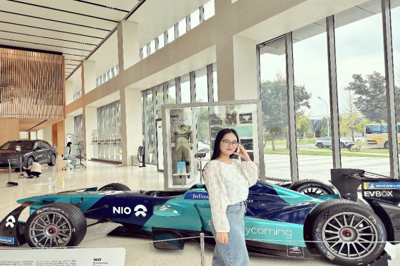 接着,留学生们满怀期待地走进了NioHouse展厅。展厅内陈列着蔚来各种最新款车型,每一款都散发着独特的魅力和科技感。留学生们有机会亲身体验了蔚来汽车的舒适座椅和先进科技。他们坐在车内,感受着座椅的柔软和贴合度,同时仔细研究着中控台的各种按钮和功能。不少留学生还拿出手机,与这些炫酷的跑车合影留念,记录下这难忘的时刻。