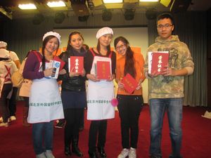 近日在北京市国际教育交流中心、北京市高教学会外国留学生管理工作研究会、北京烹饪协会联合主办的“2010北京外国留学生中国文化节——第四届外国留学生中国菜烹饪比赛”中,我校蒙古籍留学生乌云格、越南籍留学生陈芳秋荣获烹饪二等奖;哈萨克斯坦籍留学生尤杜斯获得三等奖,蒙古籍学生赛娜、加拿大籍学生谢利获得优秀奖。