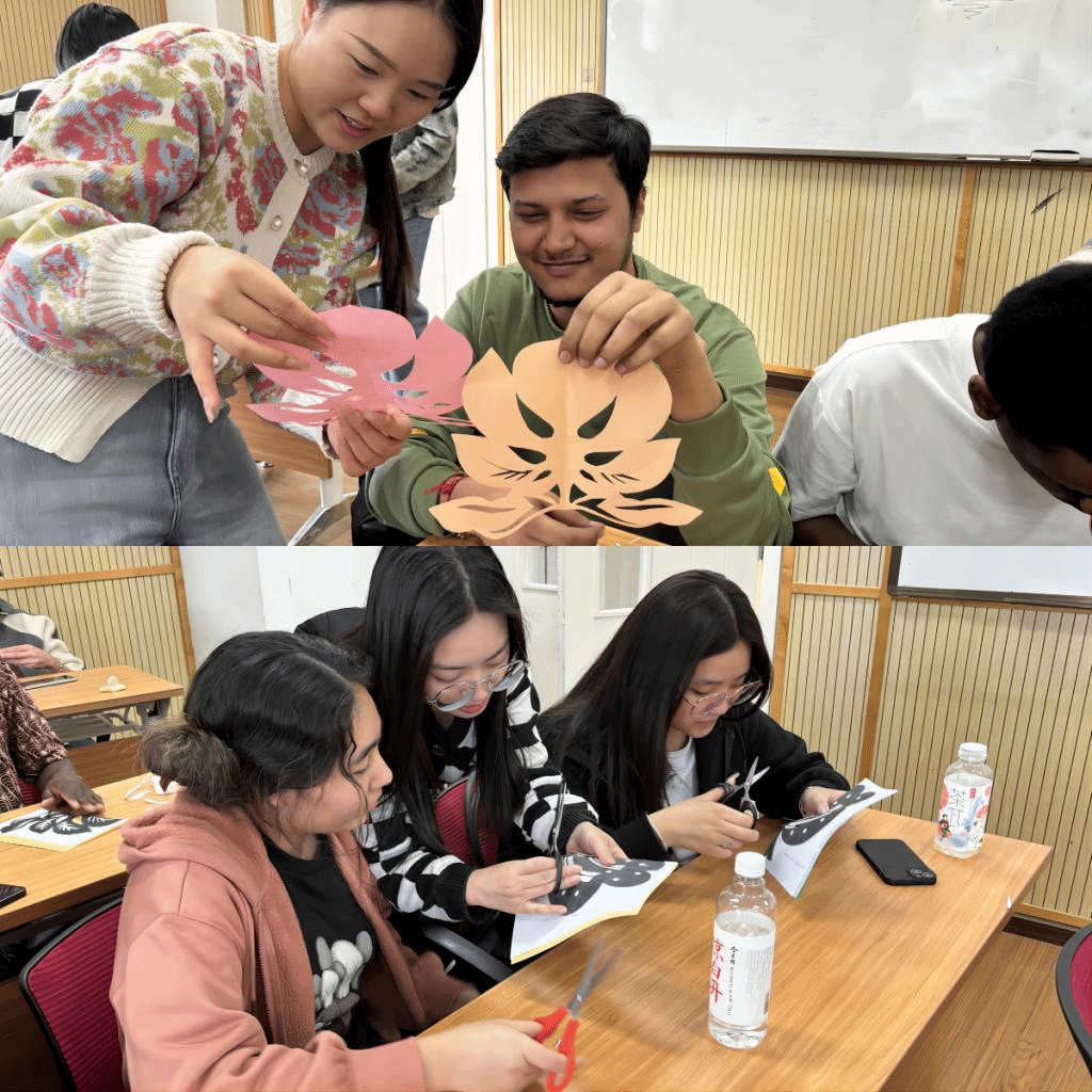 活动伊始,来自国际中文教育专业的中国籍硕士研究生姚萌琦、庞玉玲为同学们介绍了剪纸的起源、发展和技艺特点,并进行了剪纸演示。随后,同学们拿起剪刀和彩纸,创作自己的剪纸作品。一片片树叶、一根根树枝,在同学们的细心修剪下,诞生了一幅幅精美的“五彩树”剪纸。