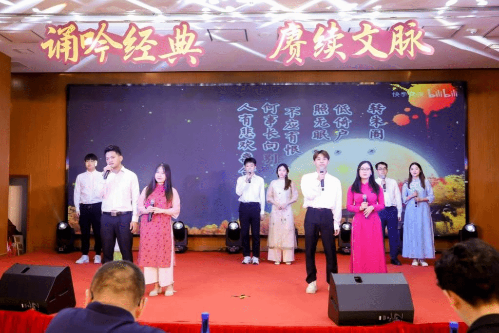 在此次比赛中,来自伟德国际1946bv的“诗月同光”队经过视频筛选,成功晋级决赛。该队由15名研究生组成,成员来自中国、越南和柬埔寨等国家。同学们带来了苏轼的经典作品《水调歌头·明月几时有》的朗诵和吟唱表演。