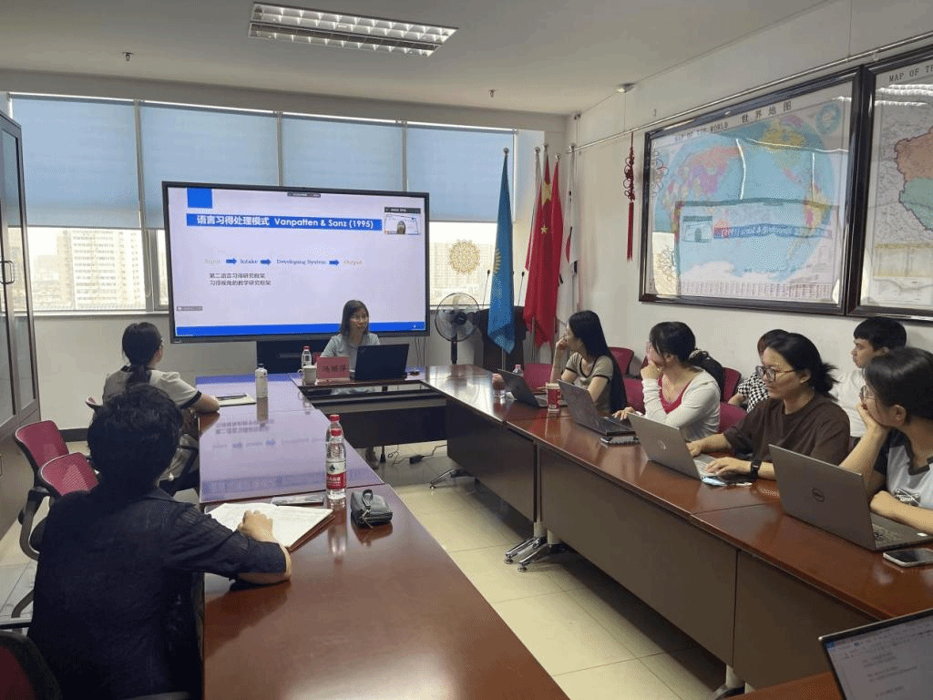 首先,冯丽萍教授向同学们介绍了第二语言习得模式,讲解了其是如何指导二语习得研究内容的确定和习得视角教学研究框架的构建,随后详细介绍了二语习得模式中的输入、学习、输出三个环节,并分析了这三个环节的影响因素。