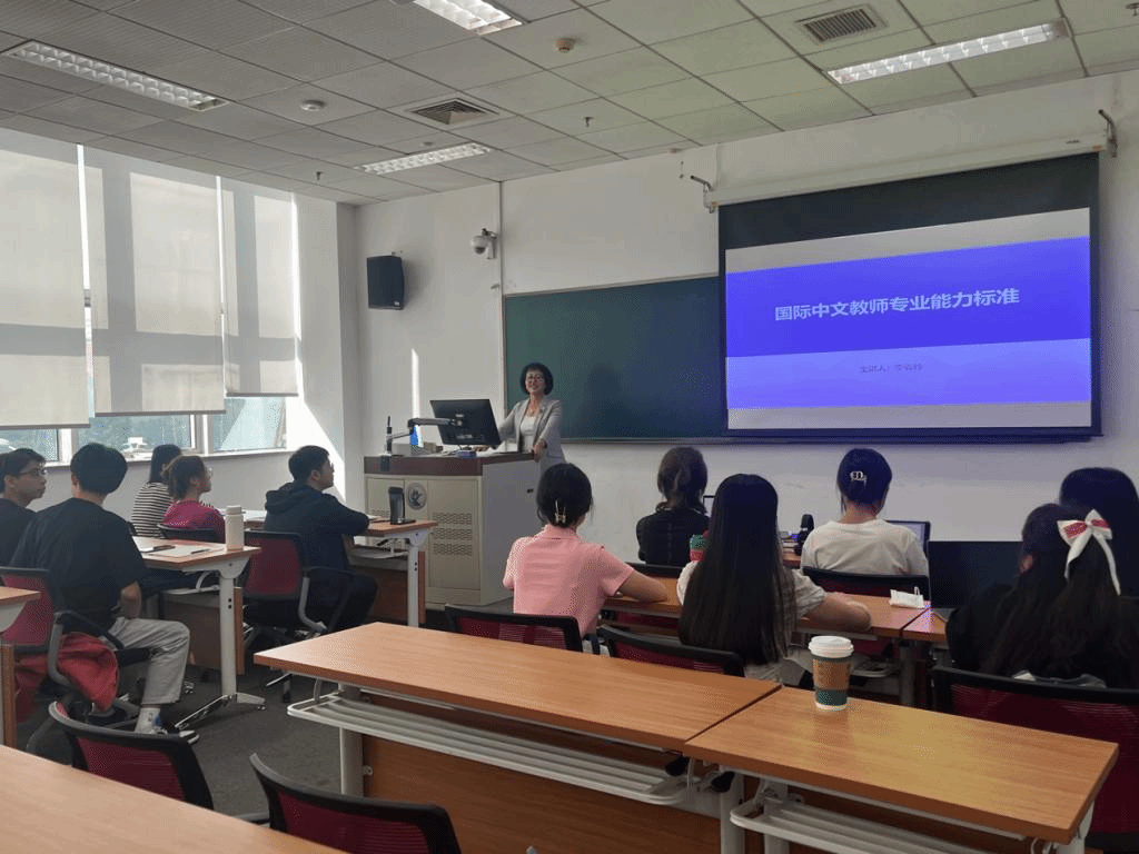 9月20日,伟德国际1946bv直属党支部书记、院长李春玲教授在中财大厦二层案例7教室以“国际中文教师专业能力标准”为主题,为2023级汉语国际教育专业研究生讲授了开学第一课。